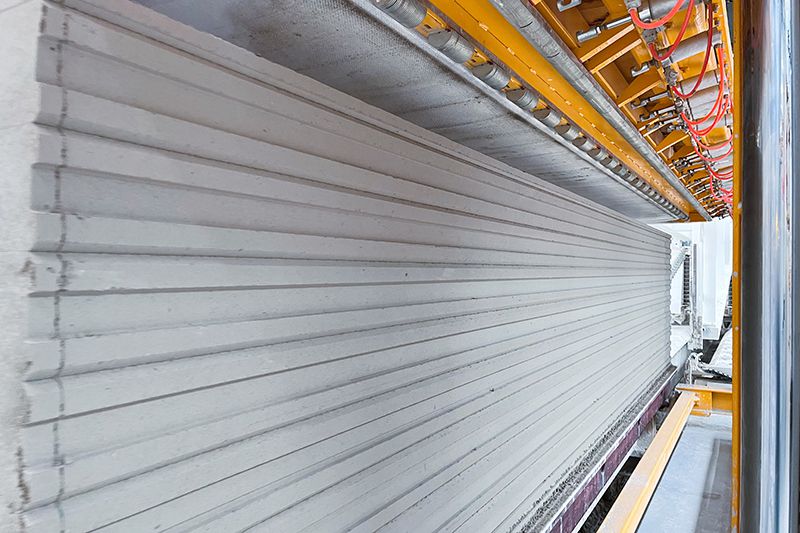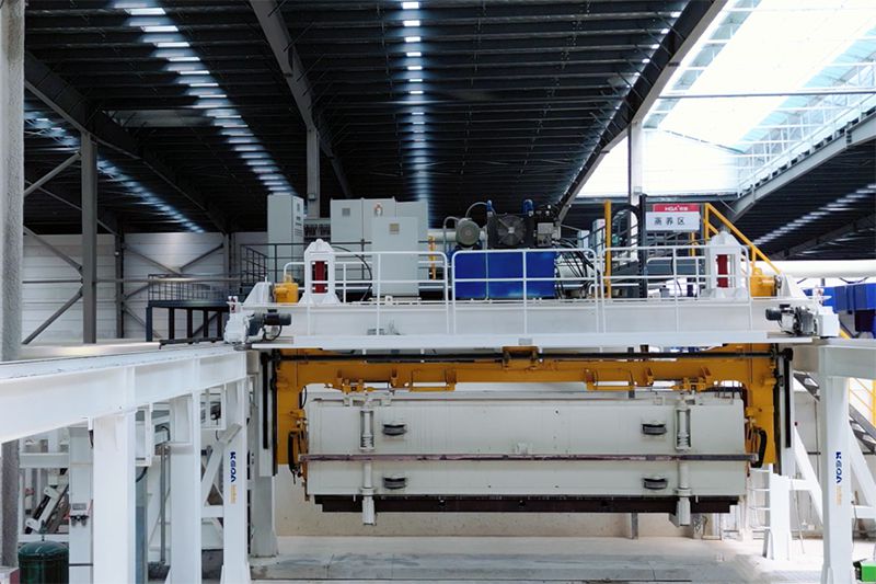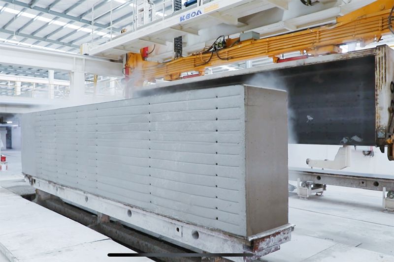 Una vez completado el vertido, el molde con lechada se transporte a la cámara de precurado. La reacción química resulta en la expansión y la formación del bloque verde poroso. A continuación, el bloque verde poroso se corta al tamaño deseado del producto. Los seis lados de la torta se cortan en superficies lisas por el sistema de corte. El procesamiento de muesca de placa también puede estar completo en la sección de corete evitando la acumulación de residuos sólidos en comparación con el procesamiento de muesca después de la autoclave.